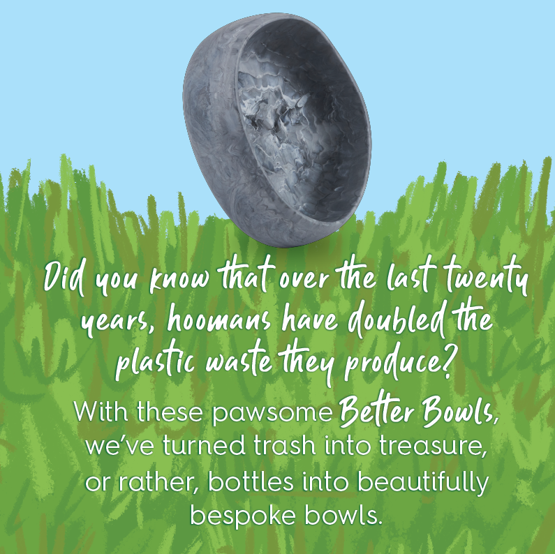 Did you know that hoomans now produce 2 x more plastic waste than 20 years ago? Our mission was to find a better way and you're looking at it! We sniffed out the grreatest fellow Aussie business to help us turn trash into treasure... or rather, bottles into bowls.