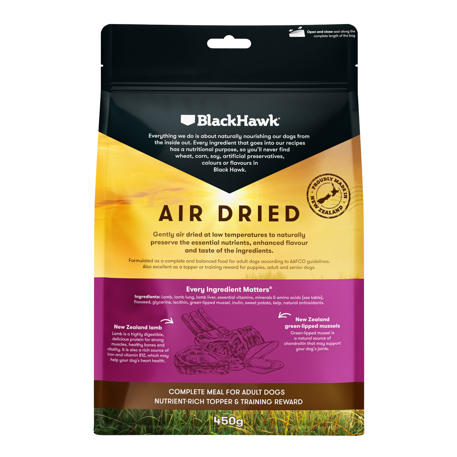 Made with 94% New Zealand lamb, including liver, Black Hawk Air Dried Lamb is a highly nutritious, complete and balanced diet for adult dogs. Gently air dried at low temperatures, it naturally preserves essential nutrients while enhancing the flavour and taste of the ingredients.