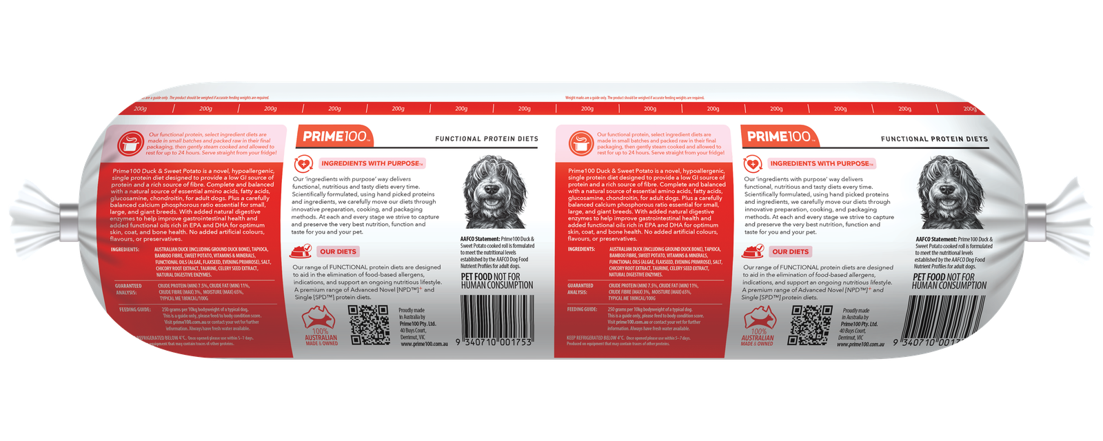 - Prime's Sk-G Duck and Sweet Potato recipe is made with premium duck meat, which is high in protein and low GI. Duck contains amino acids, glucosamine and chondroitin - all essential for large breed dogs, or dogs that are still growing