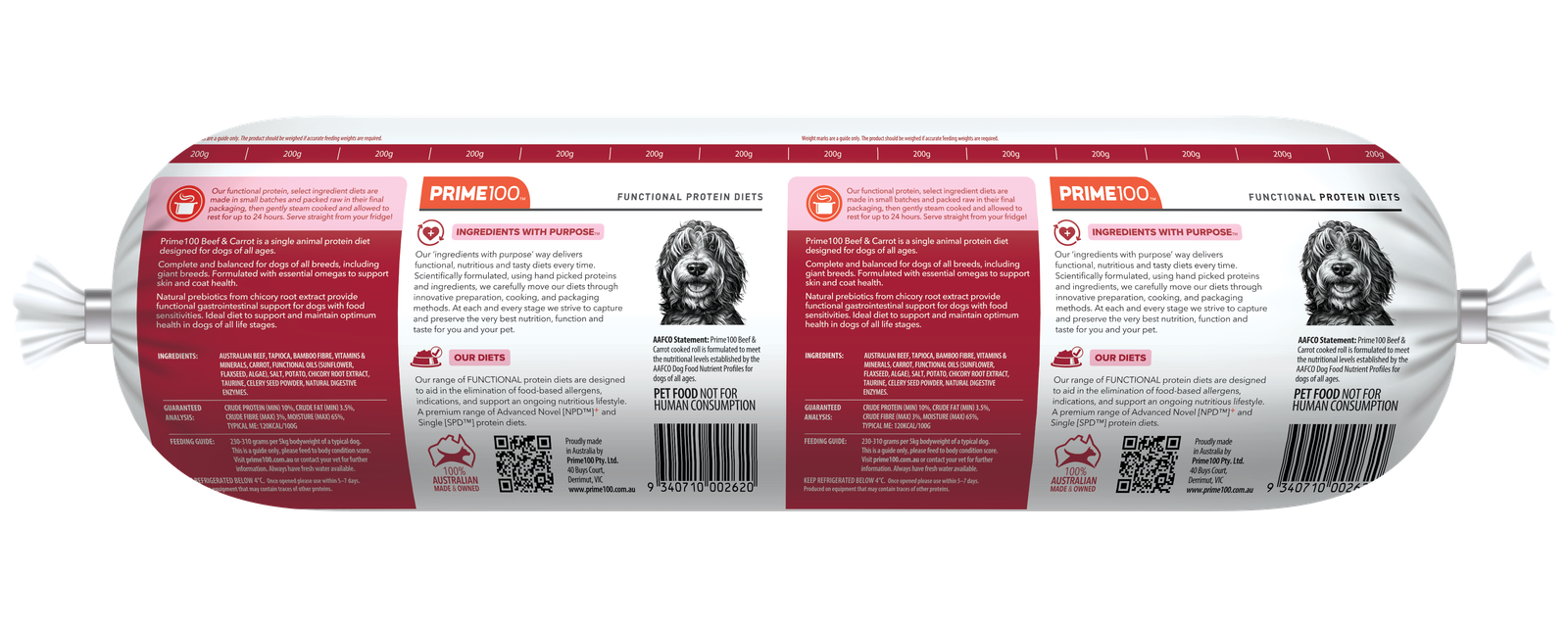 AAFCO Statement: Prime100 Beef & Carrot cooked roll is formulated to meet the nutritional levels established by the AAFCO Dog Food Nutrient Profiles for dogs of all ages.
